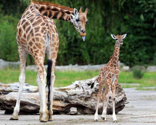 | 6-дневный жирафенок стоит со своей матерью в зоопарке Честер в английском городе Чешир. |