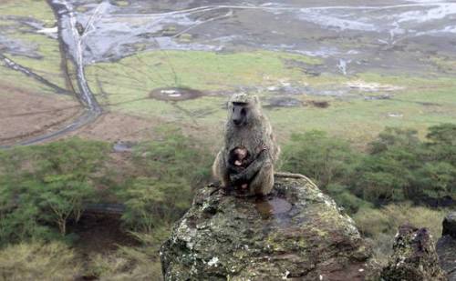 | Малыш бабуина вскарабкался на свою маму. Позади них - озеро Накуру, Кения. |