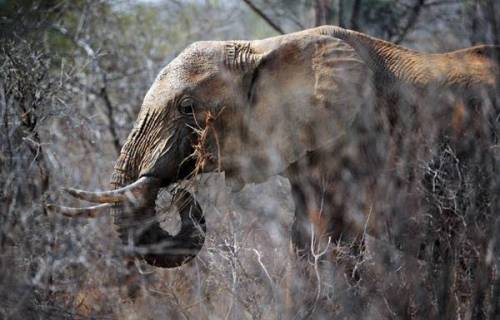 | Слон ест ветки среди сухих кустарников в Национальном парке Тсаво в южной Кении. |